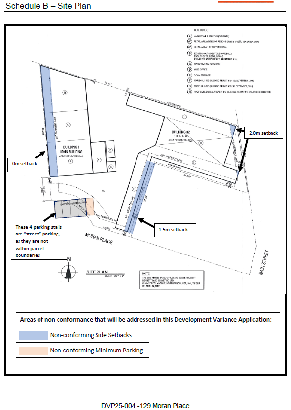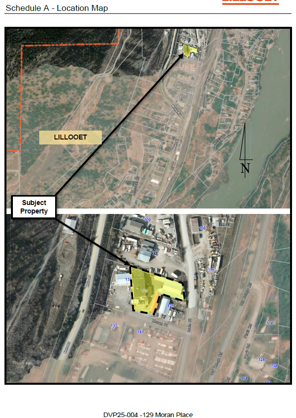 The District of Lillooet has received an application from the owners of 129 Moran Pl (File: DVP25-004) to consider a variance of Zoning Bylaw 2025-026 in relation to a building permit application to bring the property into compliance. New development is not proposed at this time but this permit will legalize existing non-conforming structures. The requested variances are:
