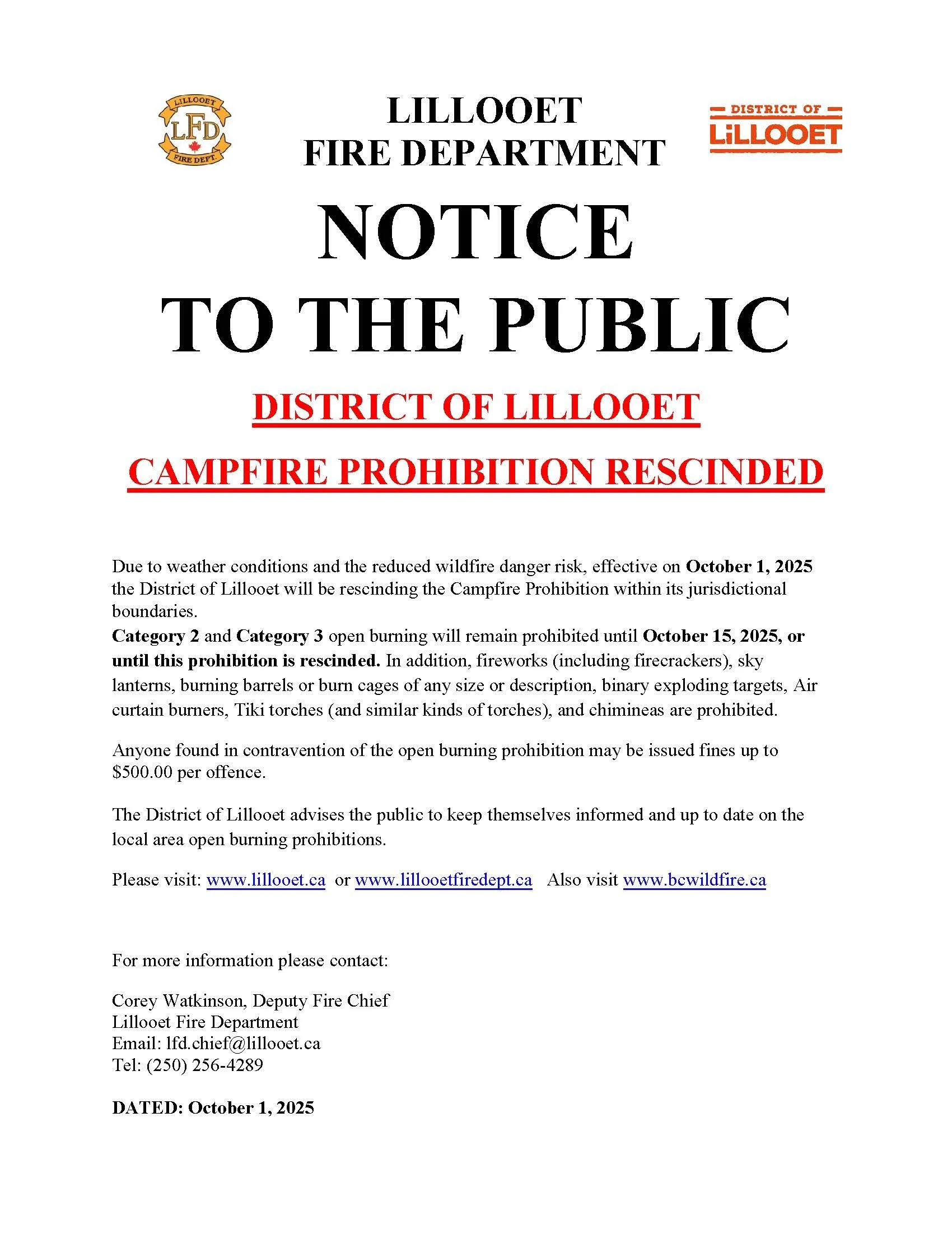 Campfire Ban Rescinded as of Oct. 1, Open Burning Prohibition in Place until Oct. 15 Oct 2 Written By Christina Timms The ban on campfires in the District of Lillooet was rescinded as of Oct. 1, 2025. The ban on open burning (of yard waste) remains in place until Oct. 15, 2025 or until rescinded by the Lillooet Fire Department. Click on image to download a PDF of notice. Christina Timms