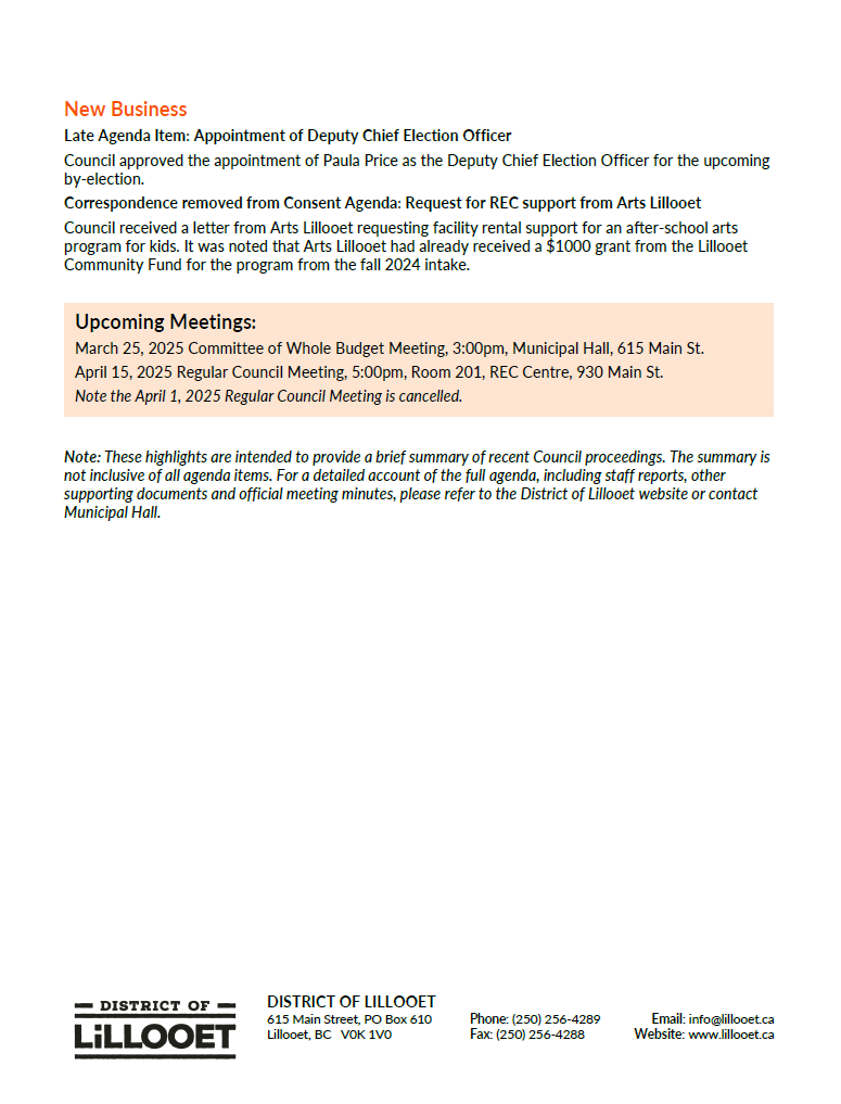 Note: The summary is not inclusive of all agenda items. For a detailed account of the full agenda, including staff reports, other supporting documents and official meeting minutes, please refer to the District of Lillooet Portal on the website or contact Municipal Hall.