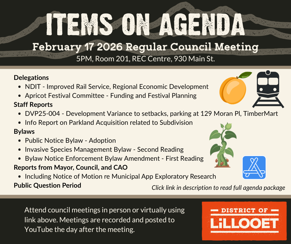 The next Regular Council Meeting is on February 17, 2026 starting at 5pm in Room 201 of the REC Centre at 930 Main St.