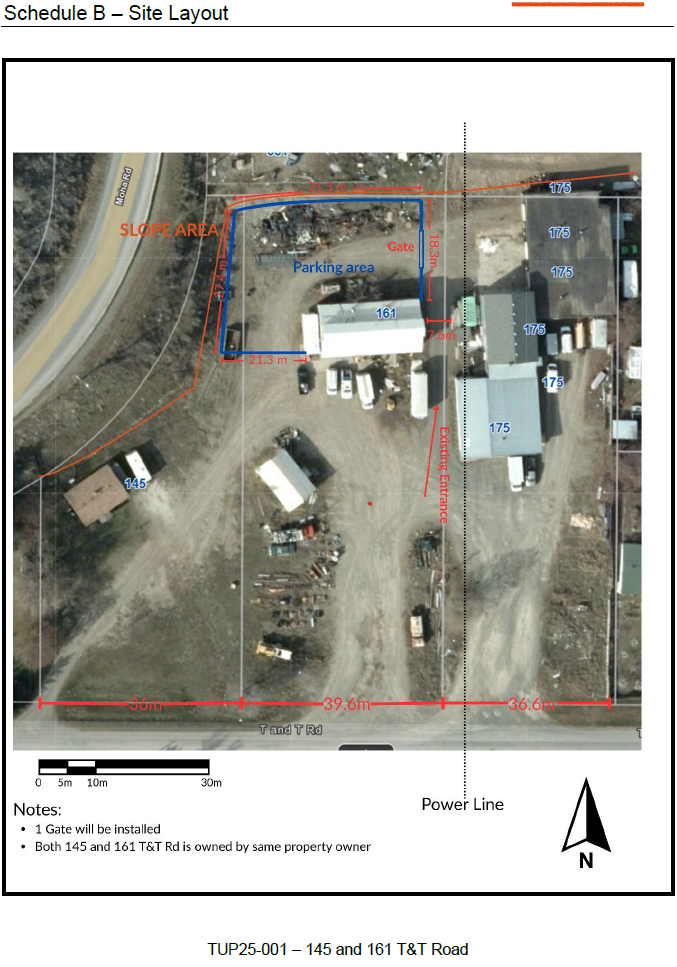 The purpose of the Temporary Use Permit is to use a portion of the properties 145 and 161 T&T Road, as shown on the map (images below), as a temporary impound storage yard. The site would accommodate approximately 20-30 impounded vehicles at a time, and held in the yard for up to 3 months. The site will not be permitted to be used as a vehicle wrecking or salvage yard. The use will be limited to storage only.
