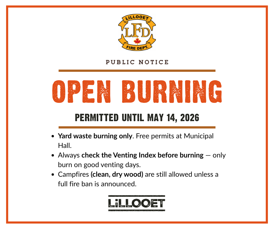Open burning is permitted within the District of Lillooet from October 15th until May 14th of 2026 or until further notice.